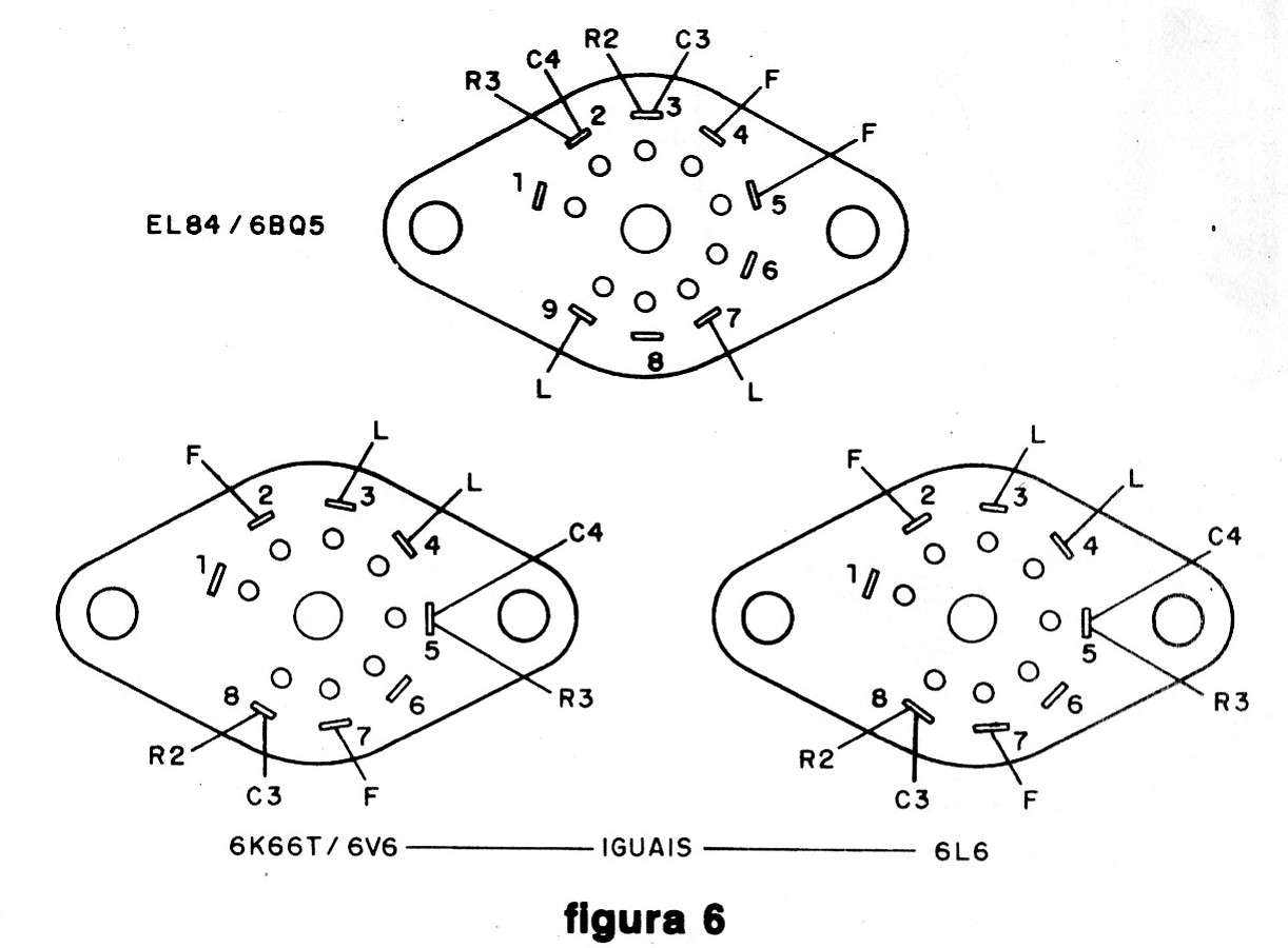 Na figura 6 damos a pinagem dos diversos tipos de válvulas que podem ser usadas. Seus soquetes são parafusados no chassi.